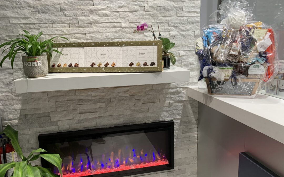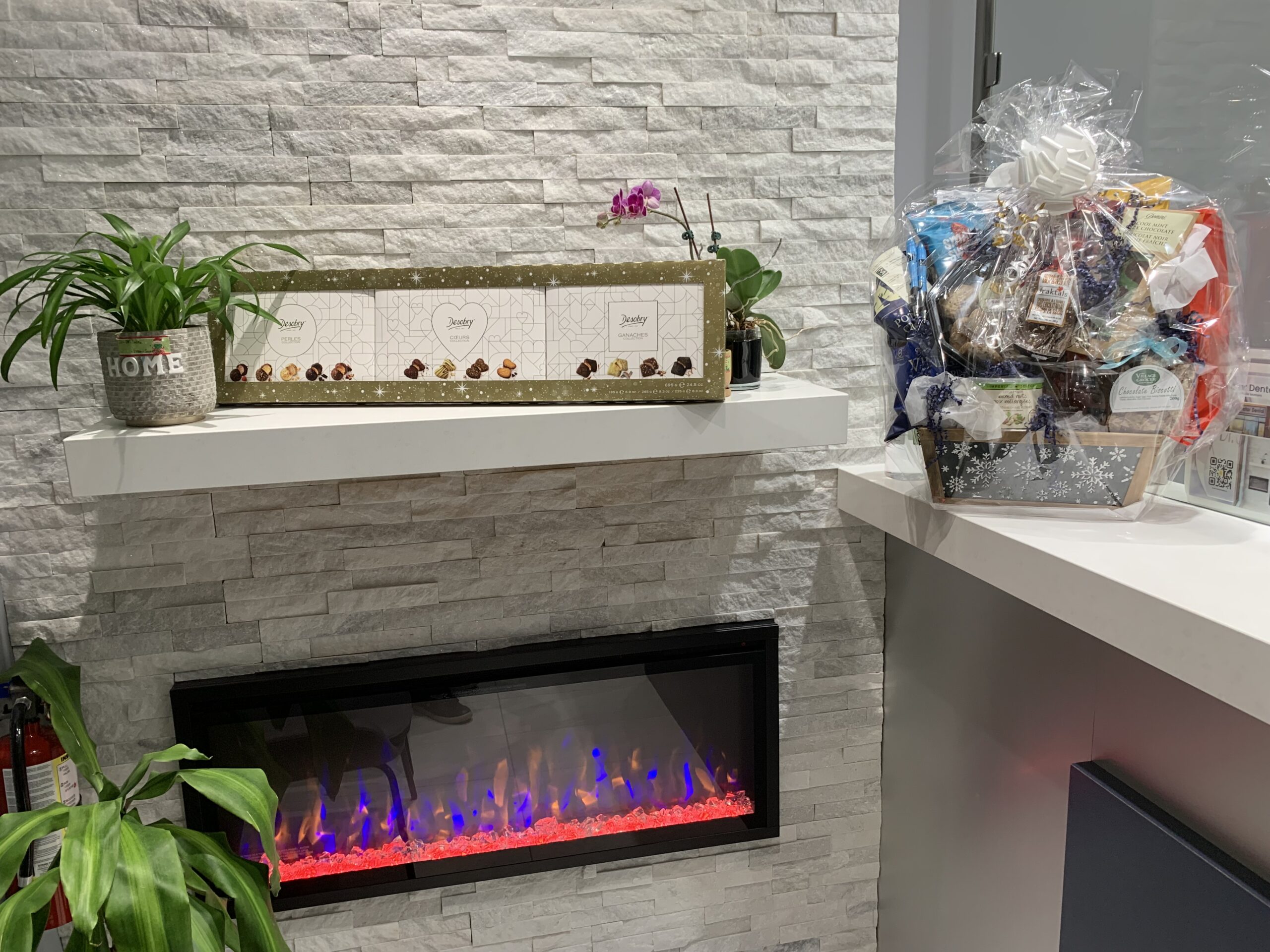 Reception area at Avatar Dental featuring a modern electric fireplace, decorative plants, a gift basket, and a “Welcome” sign